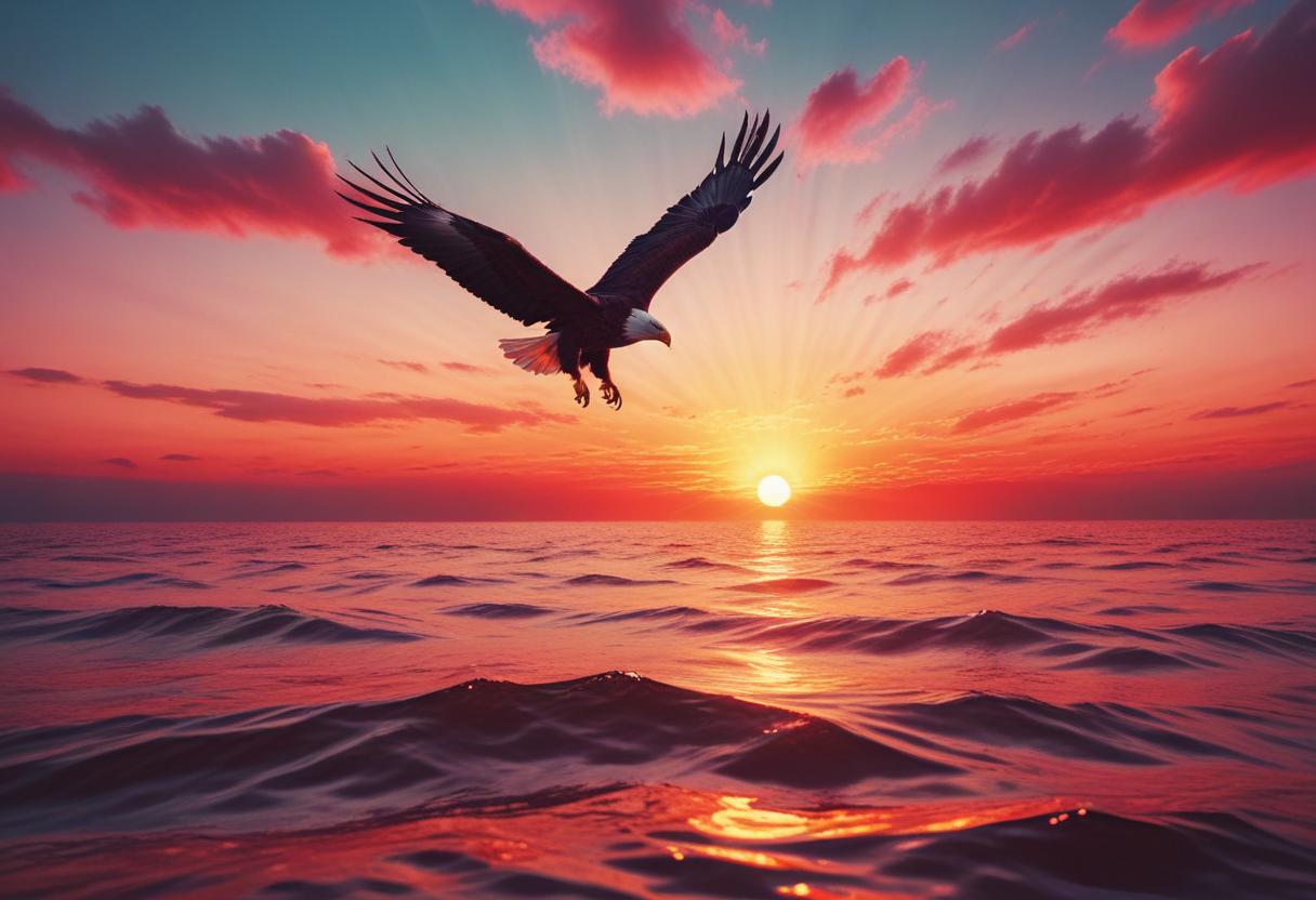 An eagle flies over a calm ocean at sunset, the sky and water reflecting warm hues of orange and pink.