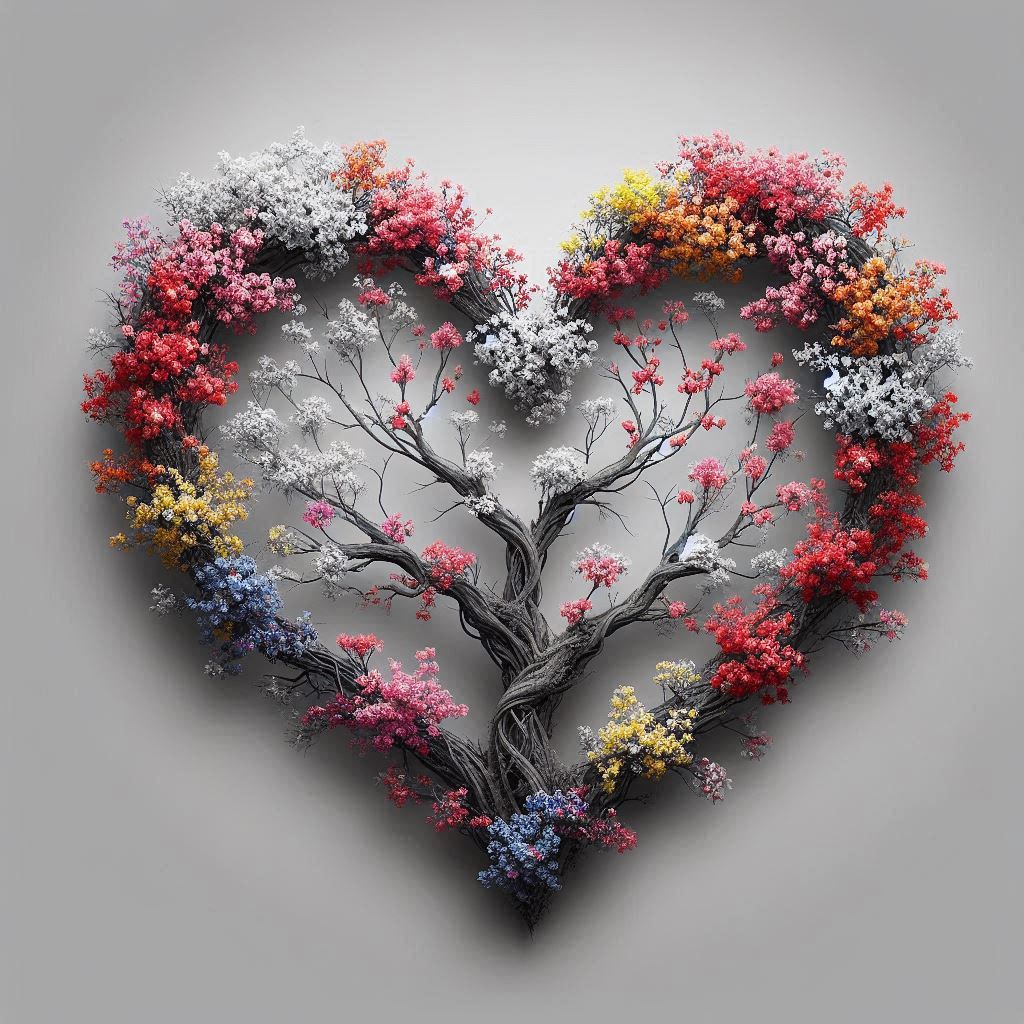 A tree with intertwined branches forms a heart shape, blossoming with vibrant red, white, and yellow flowers.