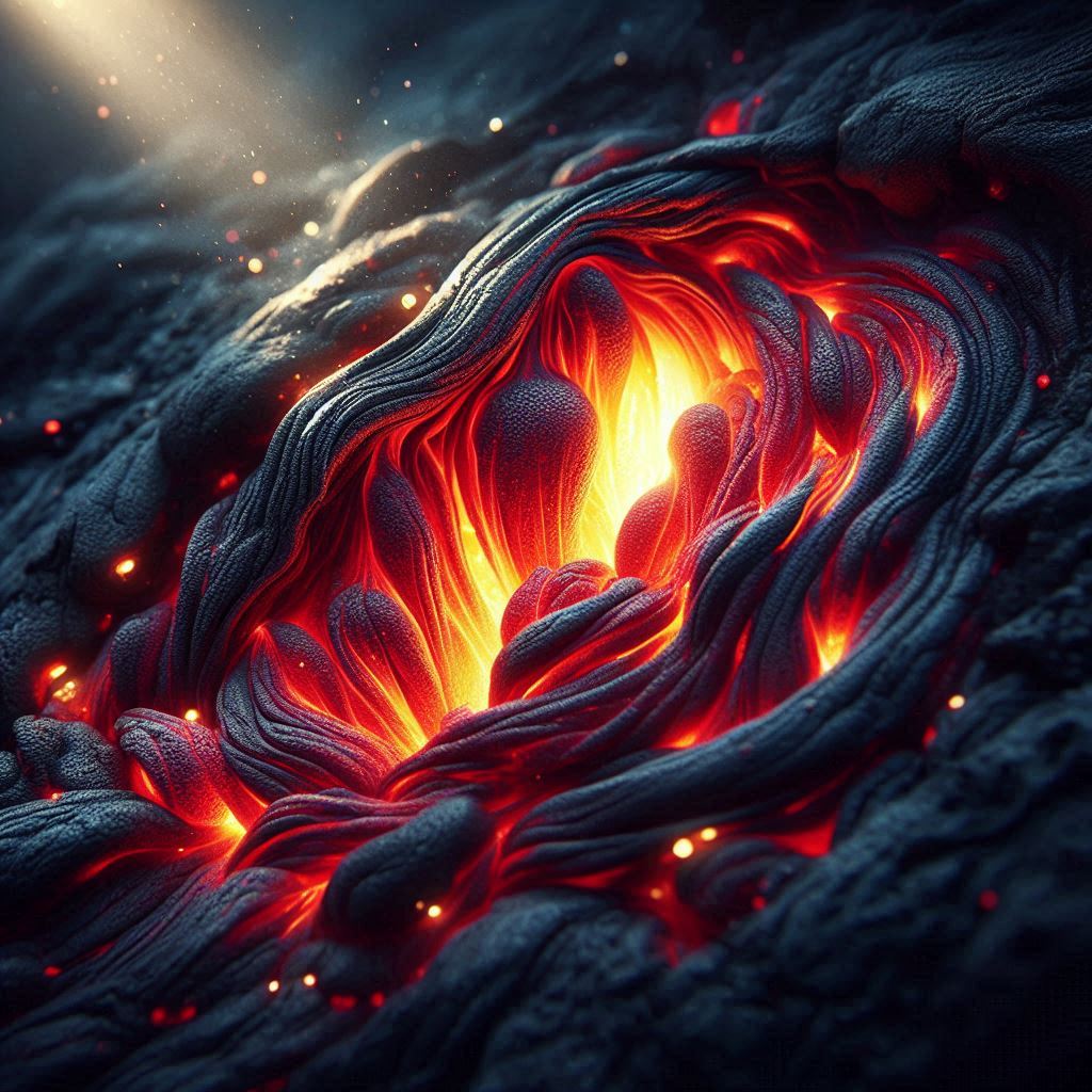 Red-hot lava flows through cracks in the earth's surface, creating a mesmerizing spectacle of light and heat.