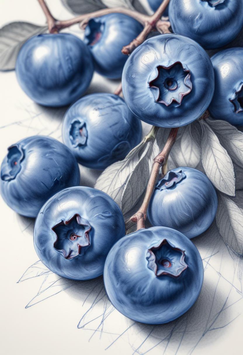 art, background, berry, blue, blueberries, branch, close-up, detail, drawing, food, fresh, fruit, illustration, leaves, life, nature, realistic, still, sweet, white