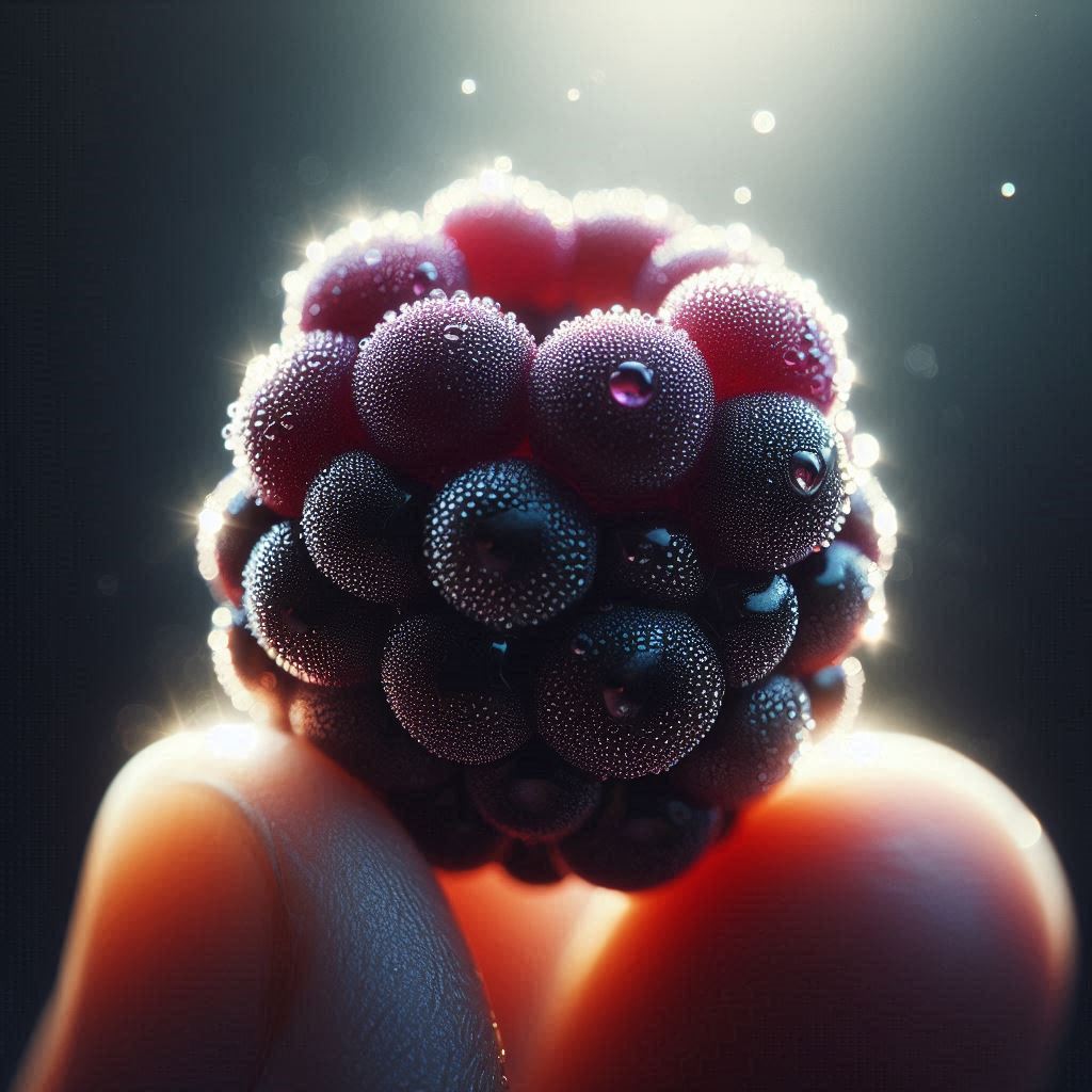 A single, ripe blackberry covered in dew drops is held in a hand, backlit by a bright light.