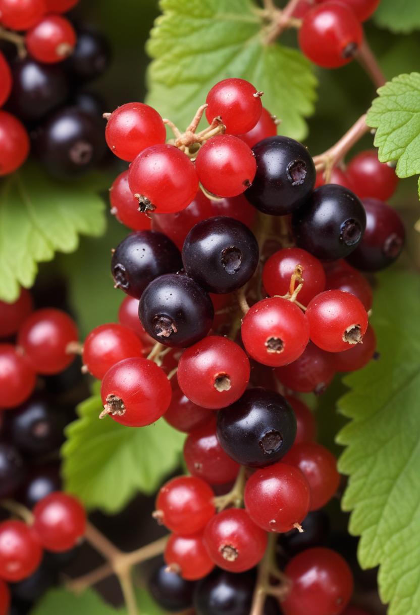 A close-up view of a cluster of ripe red and black currants growing on a branch, surrounded by green leaves.