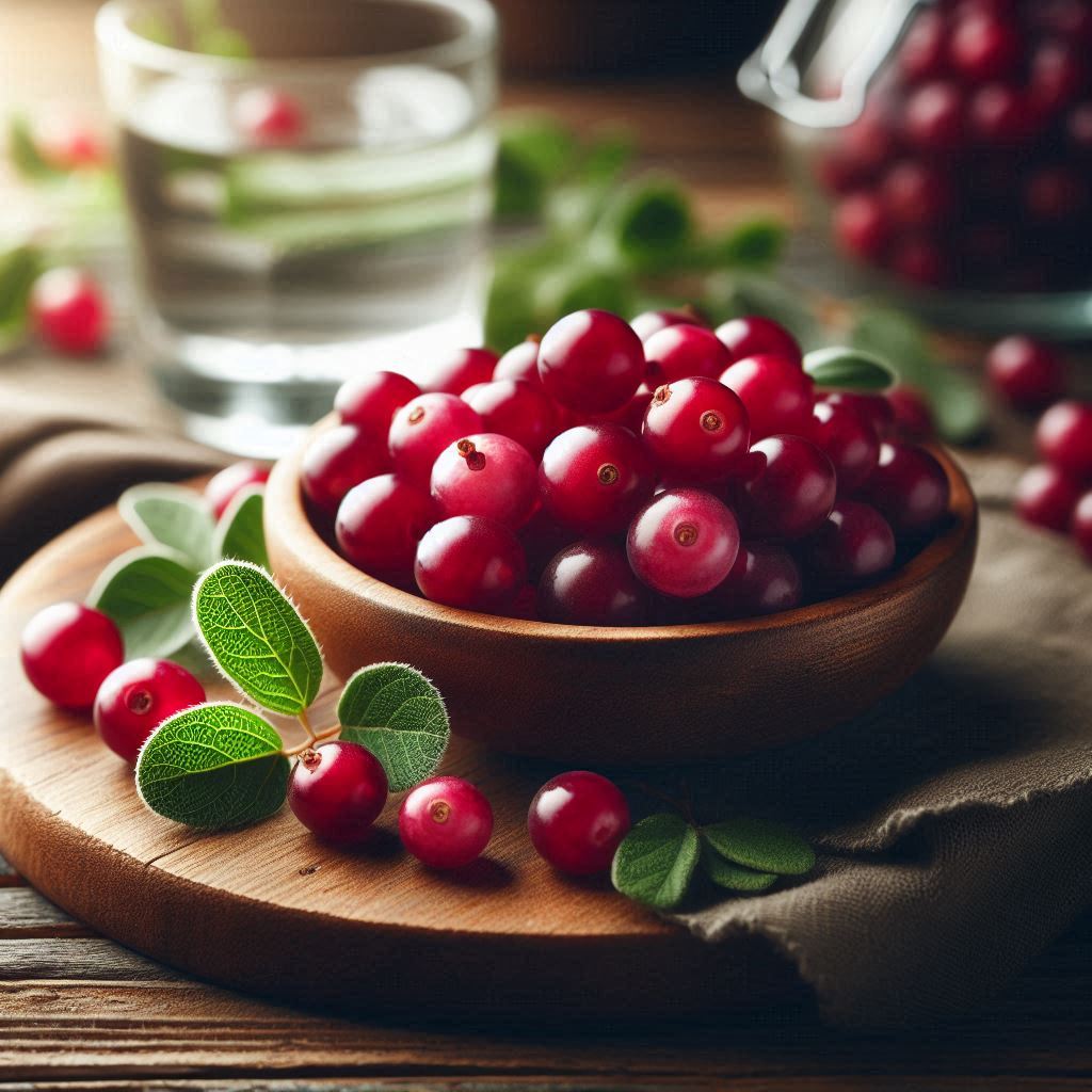 Fresh cranberries in a wooden bowl, surrounded by leaves, on a wooden table.