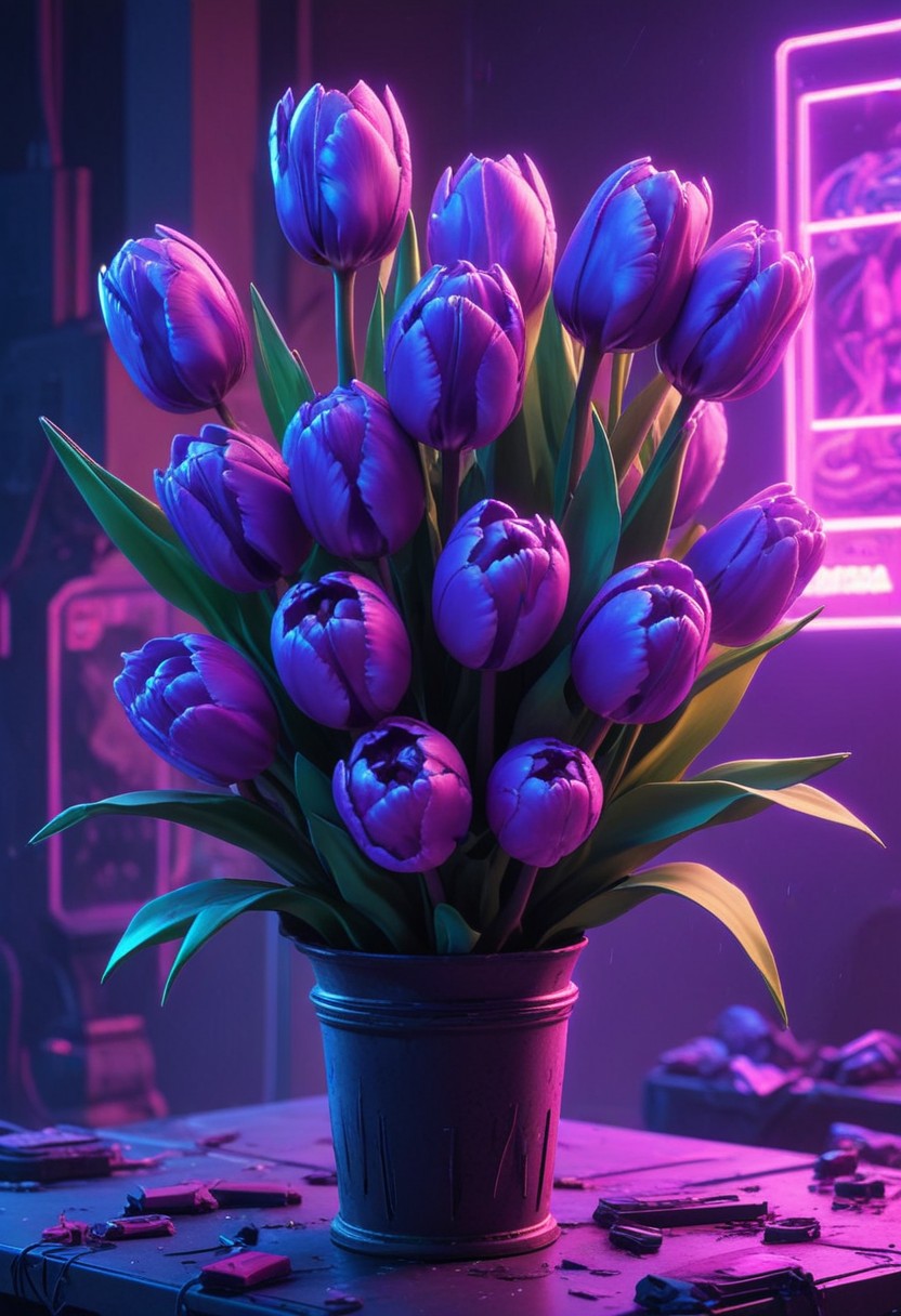 arrangement, art, black, blue, bouquet, digital, floral, flowers, illustration, life, light, neon, pink, purple, render, room, still, table, tulips, vase