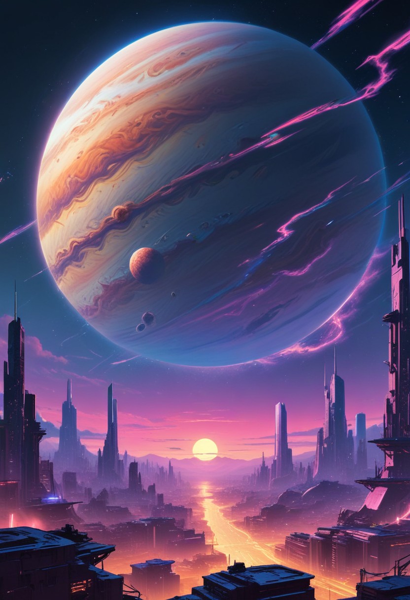 A futuristic cityscape with tall buildings and a giant planet in the sky. The sun is setting in the distance, casting a warm glow over the scene.
