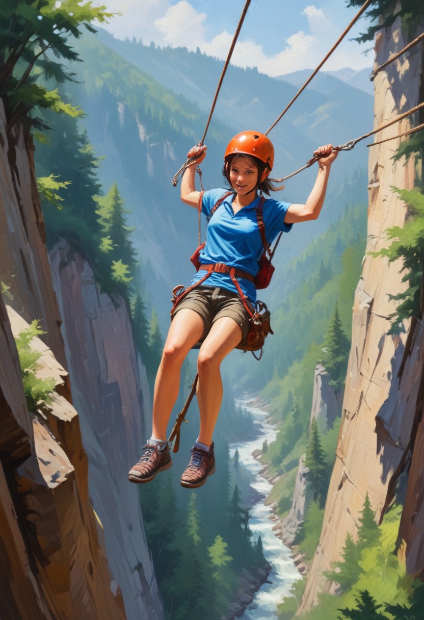 activity, adventure, cliff, forest, gorge, harness, helmet, mountain, nature, outdoor, river, rock, ropes, sky, summer, thrill, trees, valley, woman, ziplining