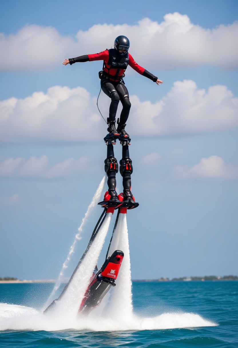 A person wearing a jetpack flies over blue ocean water on a sunny day.