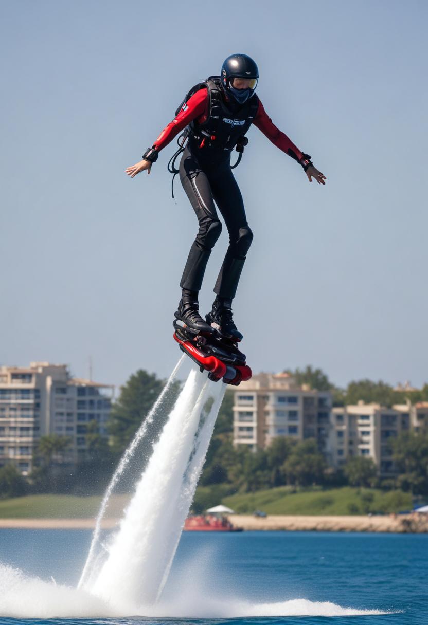 activity, adventure, air, extreme, flyboard, flyboarding, flying, fun, helmet, jet, outdoor, person, propulsion, recreation, sky, sport, sports, spray, water, wetsuit