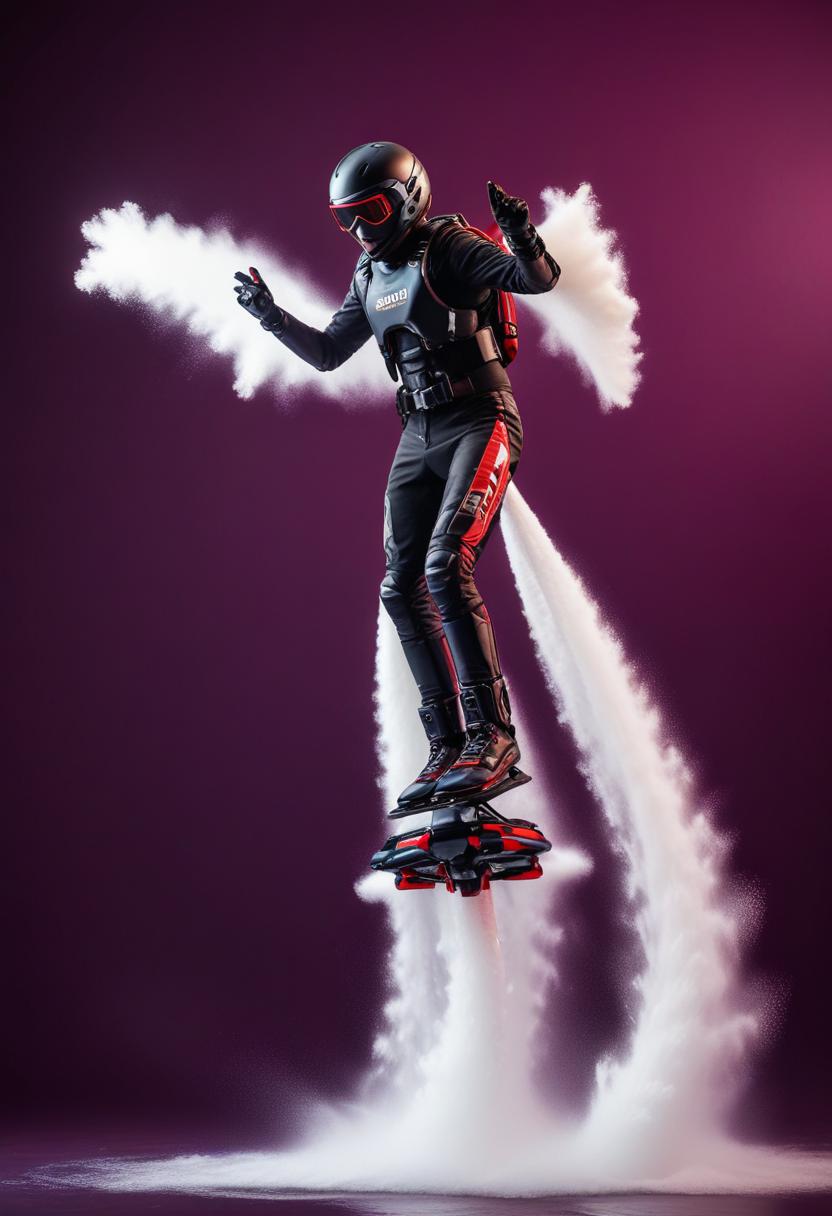 aerial, air, airborne, background, flight, flying, future, futuristic, high-flying, innovation, jetpack, person, purple, sky, smoke, technology, trail, transportation, travel, white
