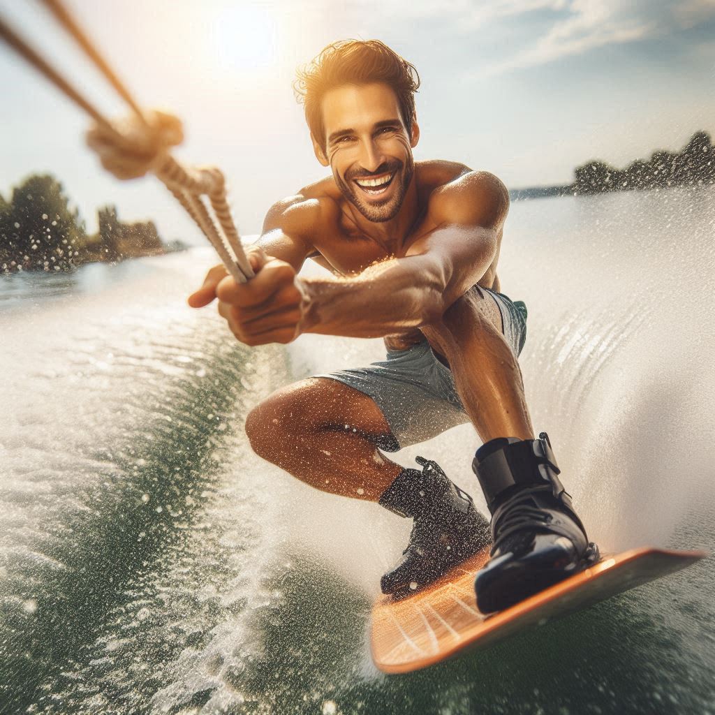 A man wakeboards on a calm lake on a sunny day. He smiles as he holds the rope, navigating the water with ease.