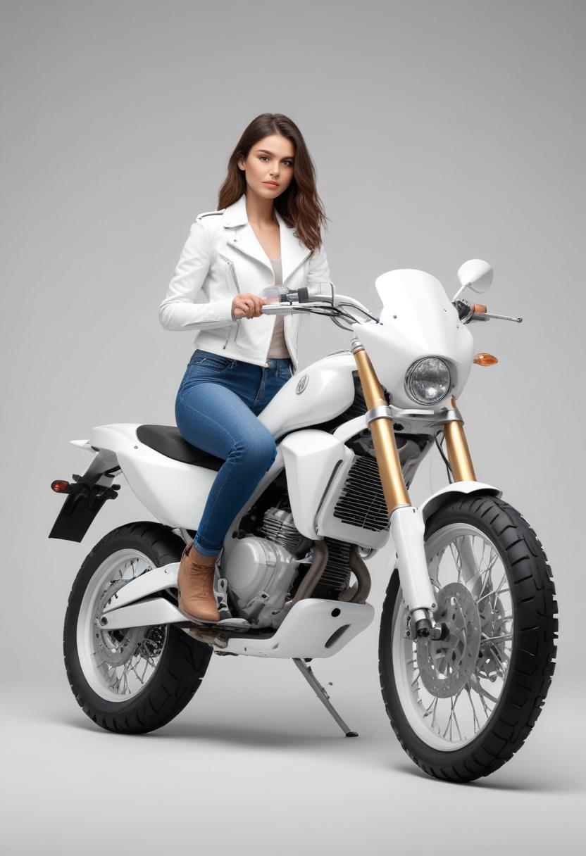 accents, background, engine, fashion, gold, grey, jacket, jeans, motorcycle, pose, rider, riding, studio, style, tires, transportation, vehicle, wheels, white, woman
