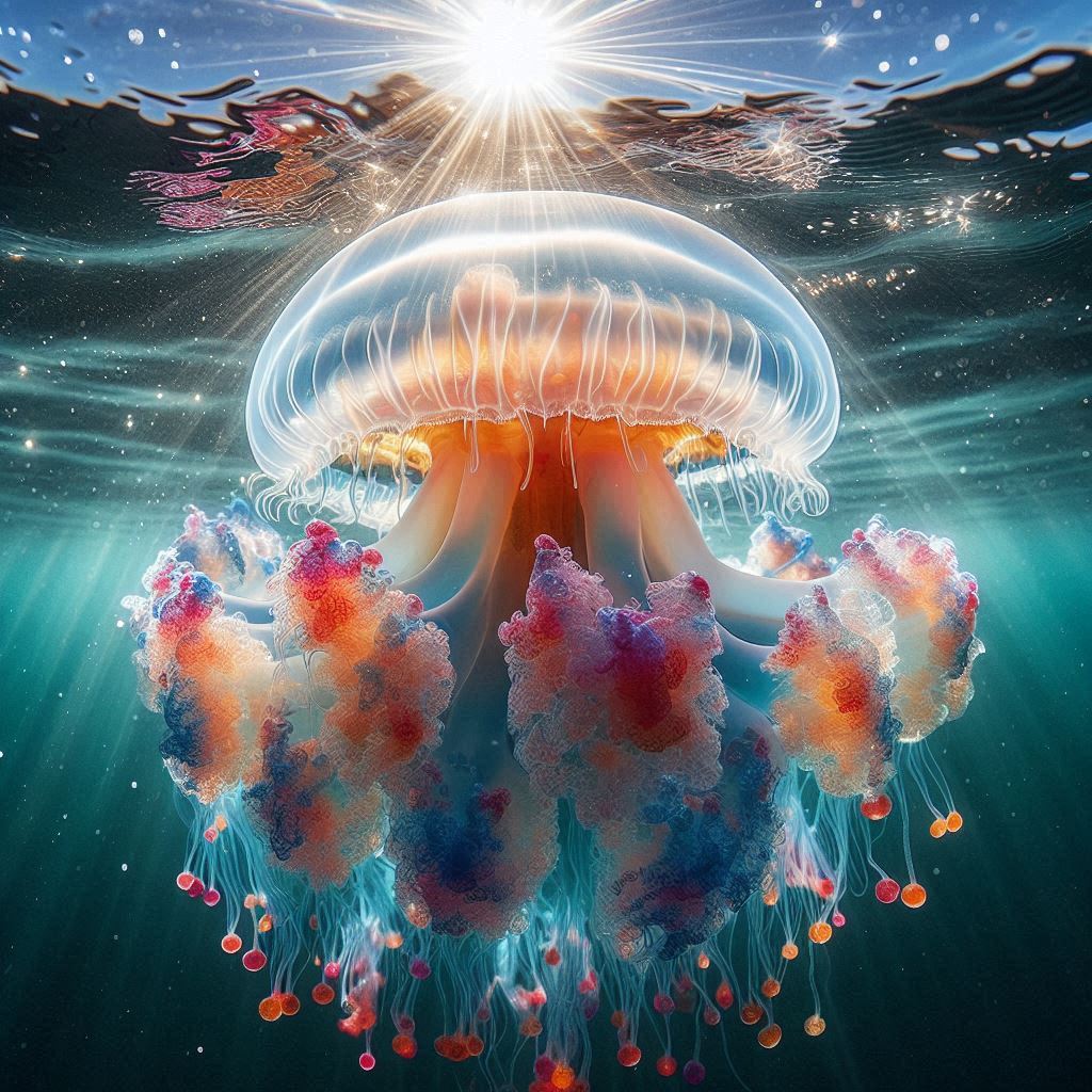 A colorful jellyfish floats in a sunlit ocean, with its bell illuminated from above.