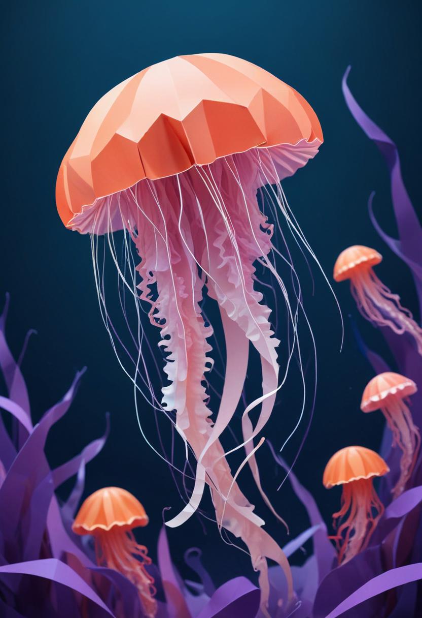 animal, art, bell, blue, design, graphic, illustration, jellyfish, marine, ocean, orange, origami, paper, pink, plant, purple, sea, tentacles, underwater, water