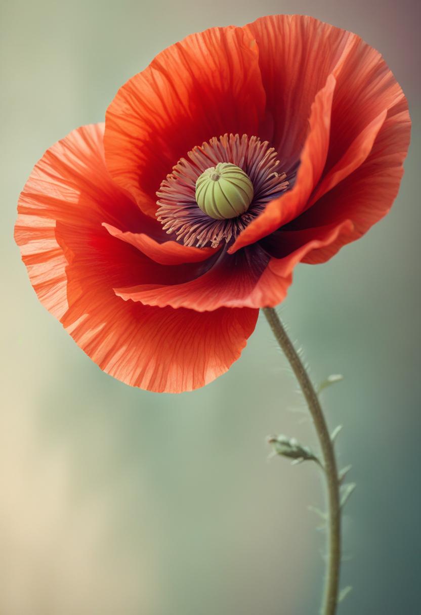A single red poppy flower with a green center and delicate petals blooms against a soft, green background.