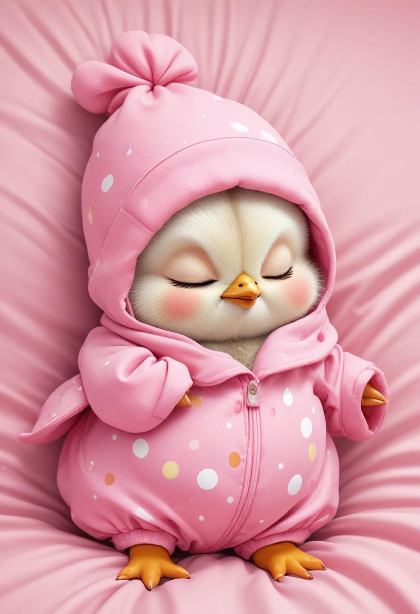 A small, fluffy chick in a pink and white polka dot pajamas with a hood sleeps peacefully on a pink bed.