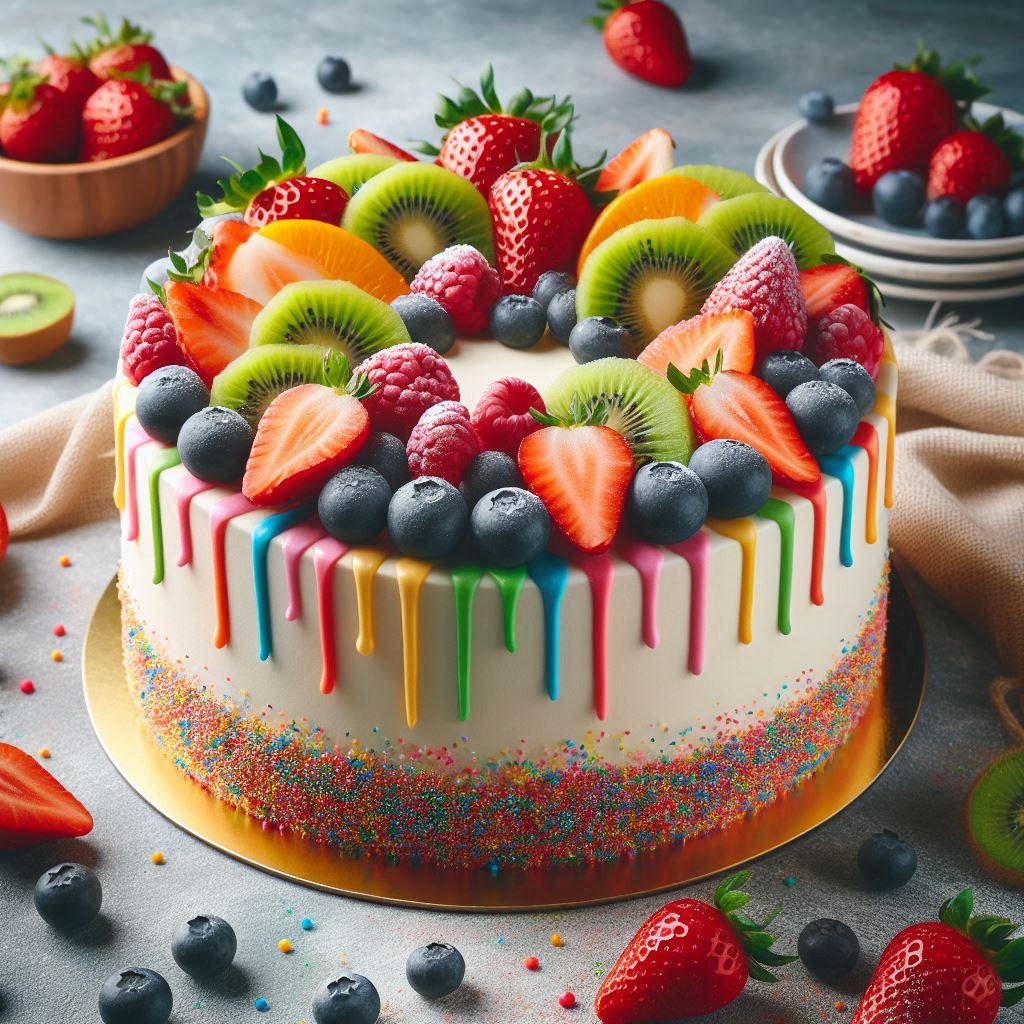 White cake adorned with fresh fruit - strawberries, kiwi, raspberries, blueberries - topped with rainbow drizzle and sprinkles