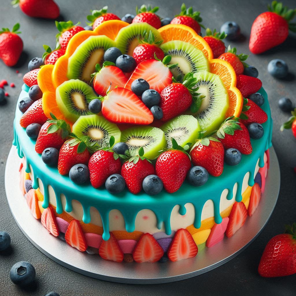 A colorful cake topped with strawberries, kiwi, and orange slices, with a blue drizzle.