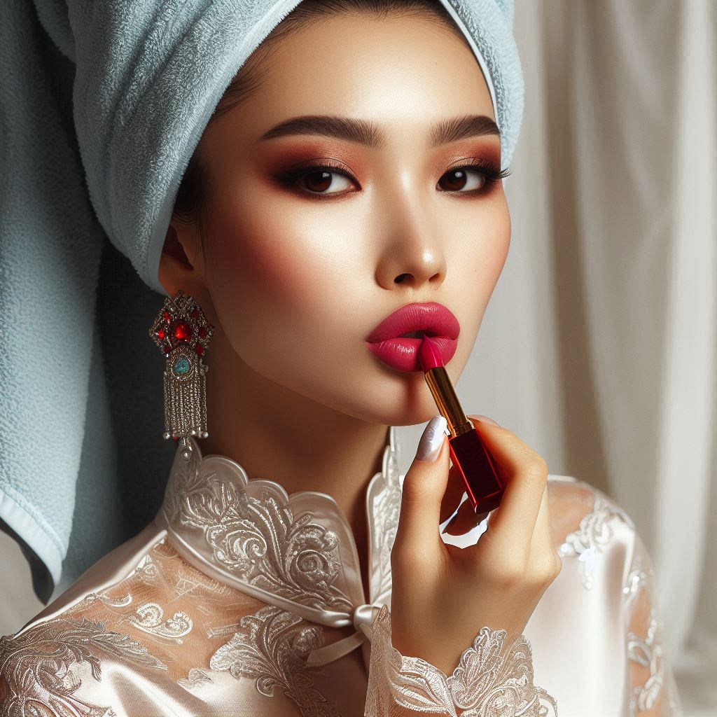 apply, asian, beauty, cosmetics, elegant, face, fashion, female, glamour, hair, lips, lipstick, makeup, model, red, routine, shower, style, towel, woman