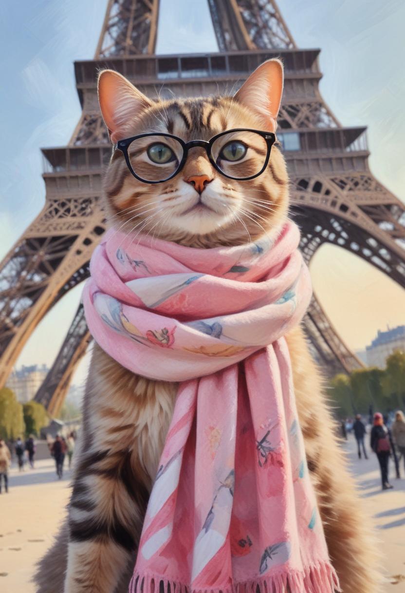 A tabby cat wearing glasses and a pink scarf sits in front of the Eiffel Tower.