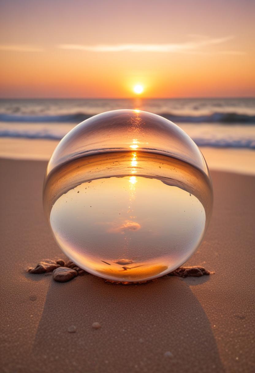 A crystal ball reflects a vibrant sunset over a calm ocean, casting a warm glow on the sandy beach.