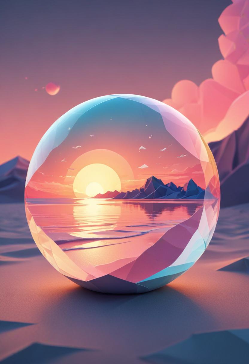 art, beach, blue, digital, dusk, evening, glass, horizon, illustration, landscape, mountains, pink, reflection, scene, sea, sky, sphere, sunset, water, white