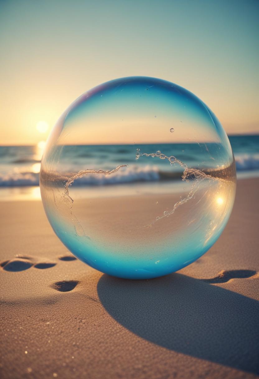 A glass orb sits on a sandy beach at sunset, reflecting the ocean and sky.