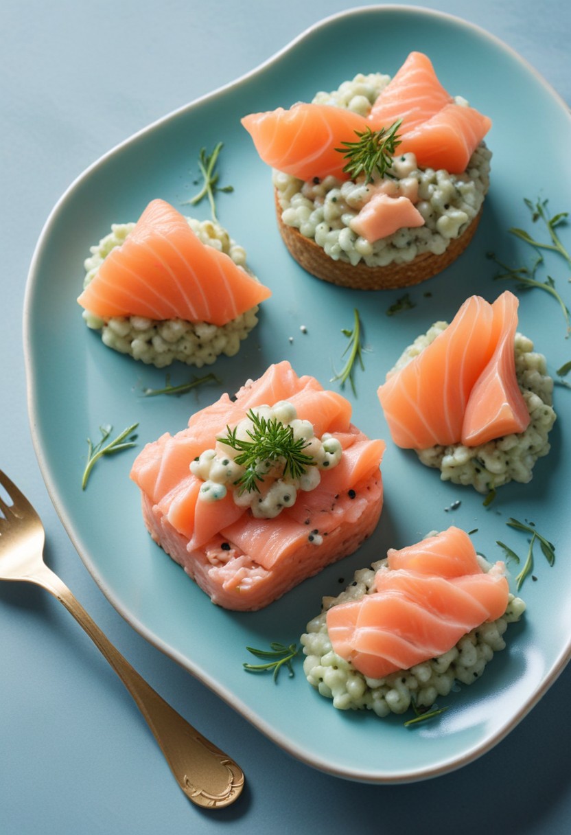 appetizer, blue, cream, cuisine, dill, dining, dish, fish, food, gourmet, kitchen, meal, party, plate, risotto, salmon, savory, seafood, snack, table