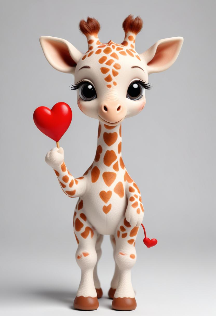 A cartoon giraffe with large eyes holds a red heart.
