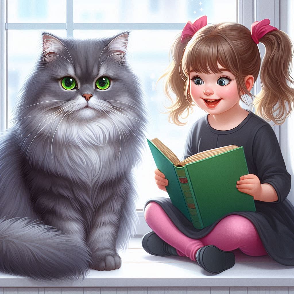adorable, animal, book, cat, cute, furry, girl, green, grey, happy, home, pet, pigtails, pink, reading, sitting, smiling, story, window, windowsill