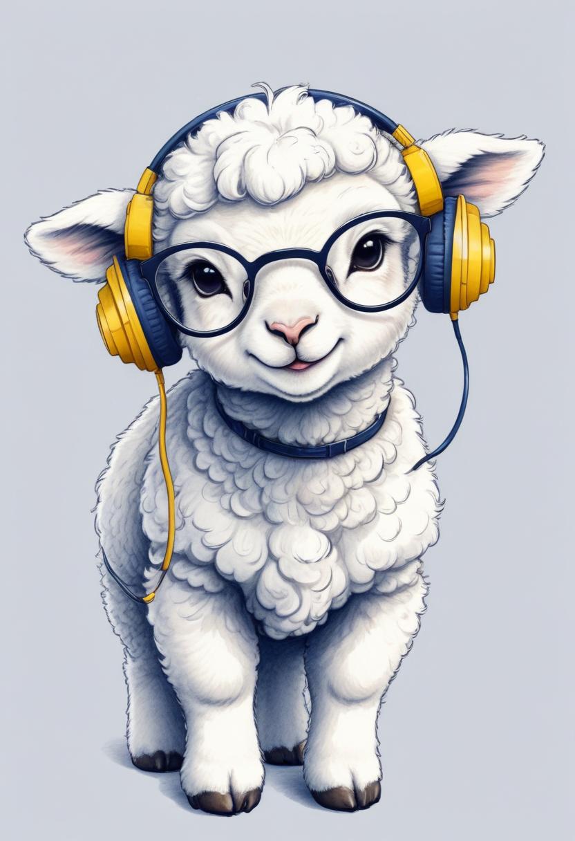 A cartoon lamb with glasses is wearing yellow headphones and looking at the viewer with a smile.