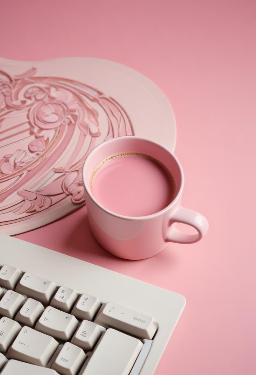 aesthetic, background, beverage, caffeine, coffee, cozy, decoration, design, desktop, drink, home, hot, keyboard, minimalist, mug, office, pink, surface, white, work