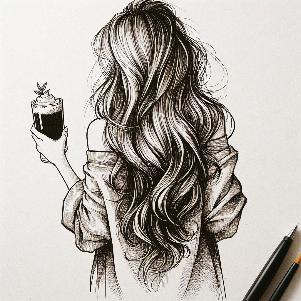 A detailed pen and ink drawing of a woman with long, wavy hair, viewed from behind, holding a beverage with a straw.