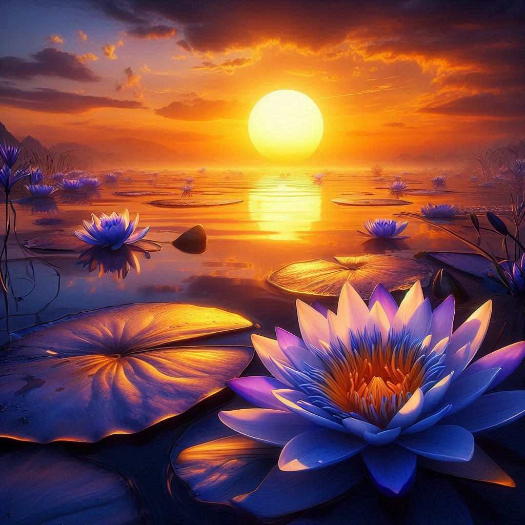 Water lilies bloom in a lake at sunset. The sun shines brightly in the sky, casting a warm glow on the water and the lilies.