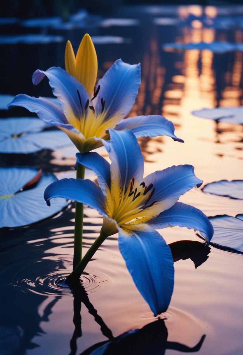 Two blue lilies with yellow centers rise from a pond, the setting sun reflecting in the water.