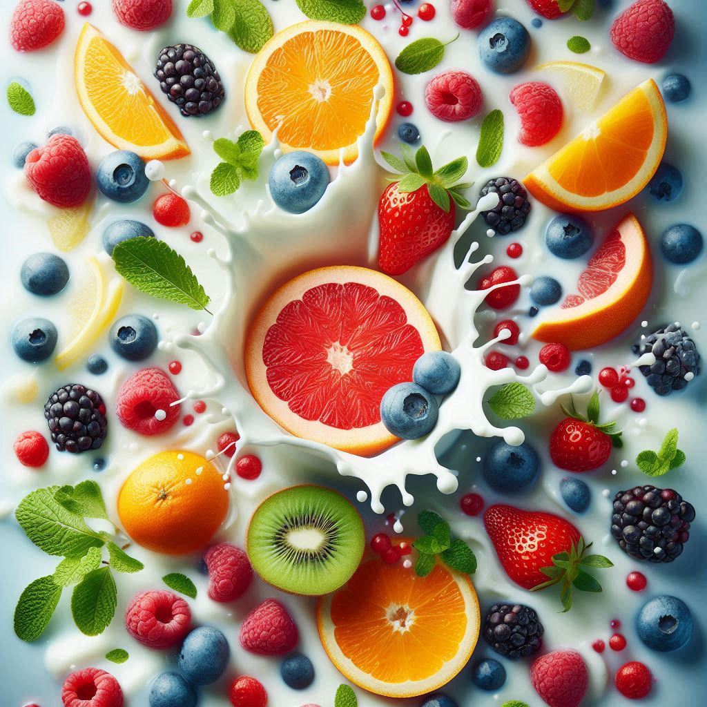blueberry, citrus, colorful, delicious, drink, food, fresh, fruit, green, healthy, kiwi, milk, orange, raspberry, red, splash, strawberry, vibrant, white, yellow