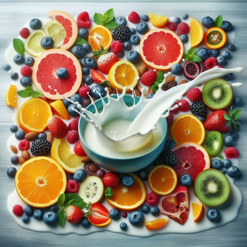 A bowl of milk is splashed with fresh fruit, creating a vibrant and colorful scene.