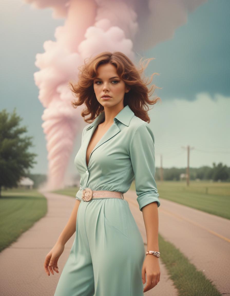 1970s, background, cloud, countryside, fashion, field, green, jumpsuit, model, outdoors, pink, portrait, retro, road, scenic, standing, style, summer, vintage, woman