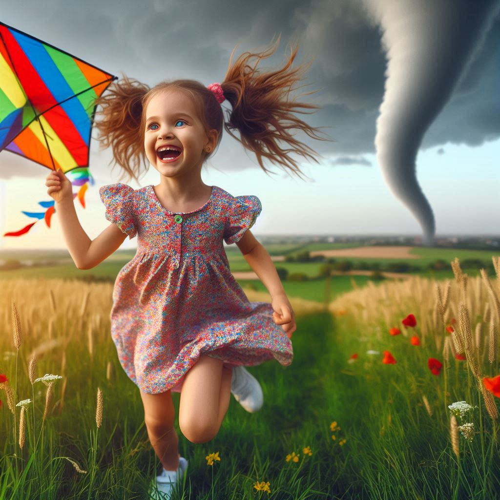 A young girl runs through a field with a rainbow kite in her hand, smiling brightly as a tornado forms in the distance.