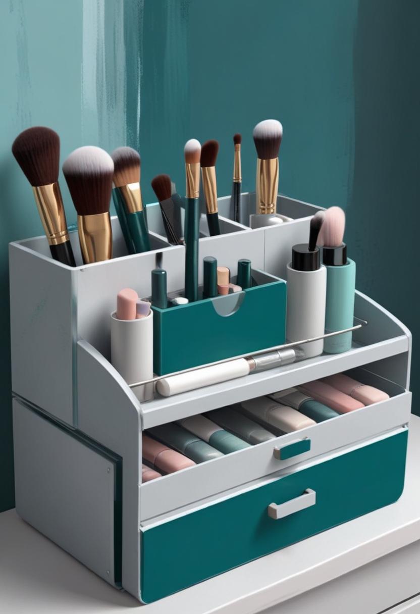 accessories, bathroom, beauty, bedroom, brushes, compartment, cosmetic, decor, drawer, gray, home, lipstick, makeup, organize, organizer, shelf, storage, supplies, teal, vanity