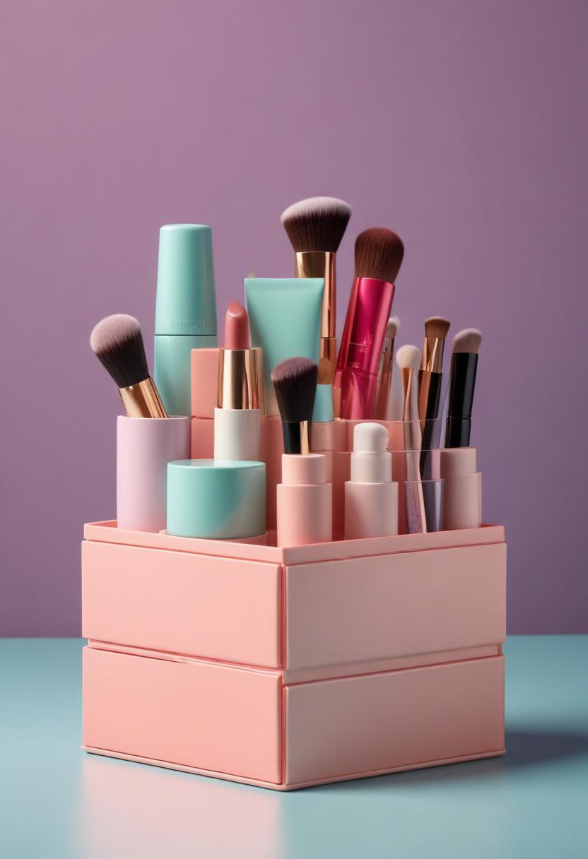beauty products, beauty tools, blush brush, brush holder, cosmetic holder, cosmetics, double tier, eyeliner, foundation, isolated background, lipsticks, makeup brushes, makeup collection, makeup stand, nude lipstick, pink box, pink containers, pink organizer, powder brush, skincare, teal cream, teal tubes, vanity organizer, makeup organizer