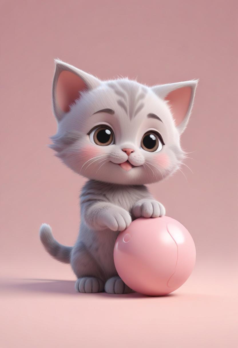 adorable, animal, ball, big, cat, cute, eyes, fluffy, furry, gray, kitten, paws, pet, pink, play, playing, small, soft, surface, toy