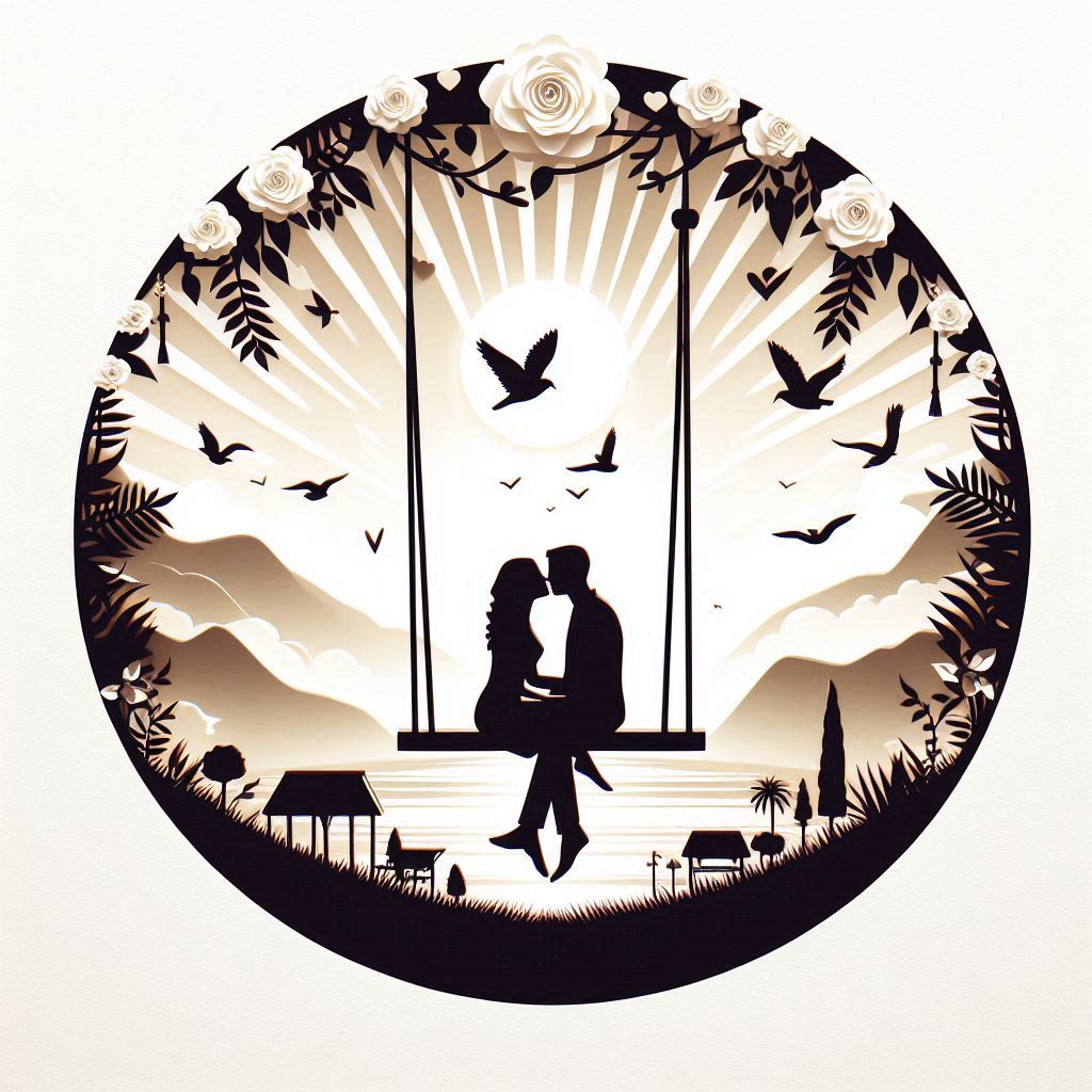 A papercut silhouette of a couple kissing on a swing with birds and flowers.