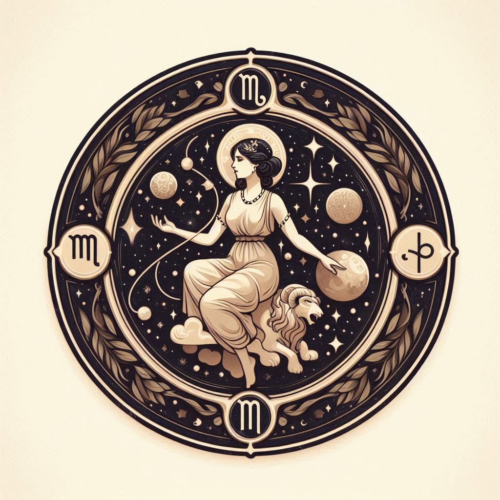 A woman in a long gown sits atop a lion, surrounded by stars and planets, within a circular frame depicting the Virgo zodiac sign.