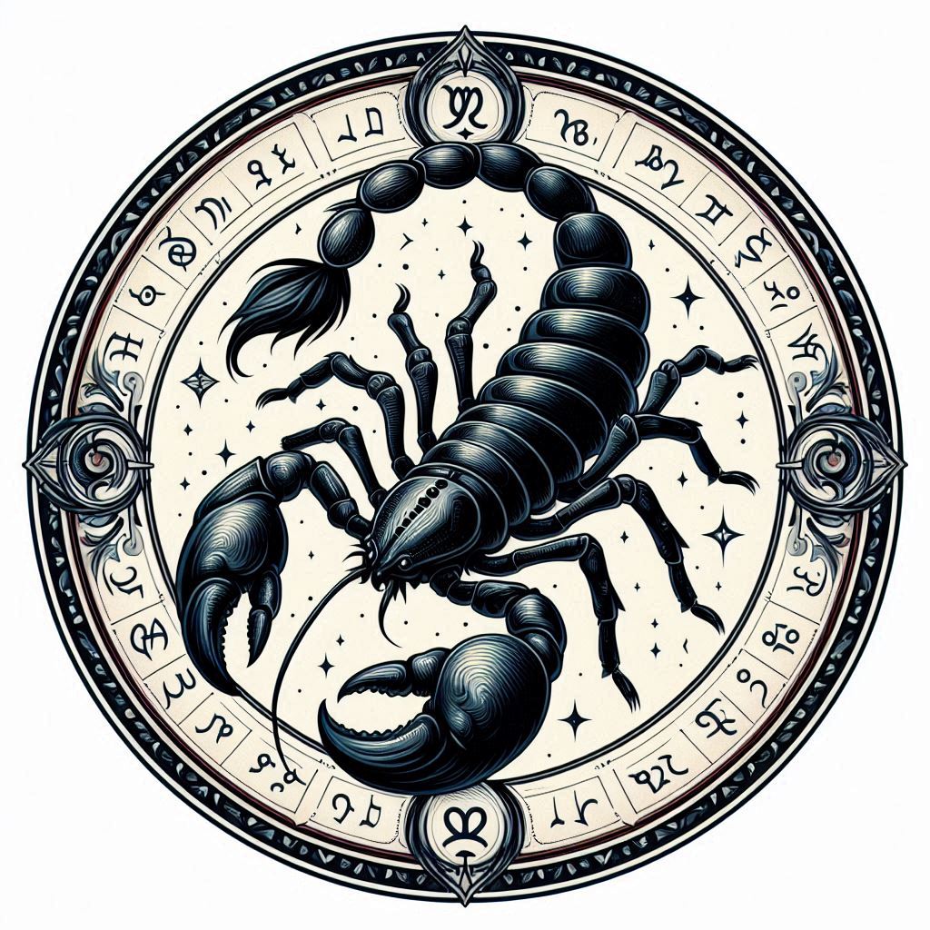 Detailed Scorpio zodiac illustration with a scorpion and stinger on a starry background with zodiac symbols