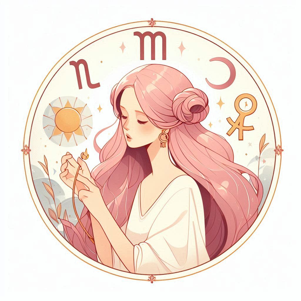 A woman with pink hair holds a flower while surrounded by astrology symbols, including the Scorpio zodiac sign.