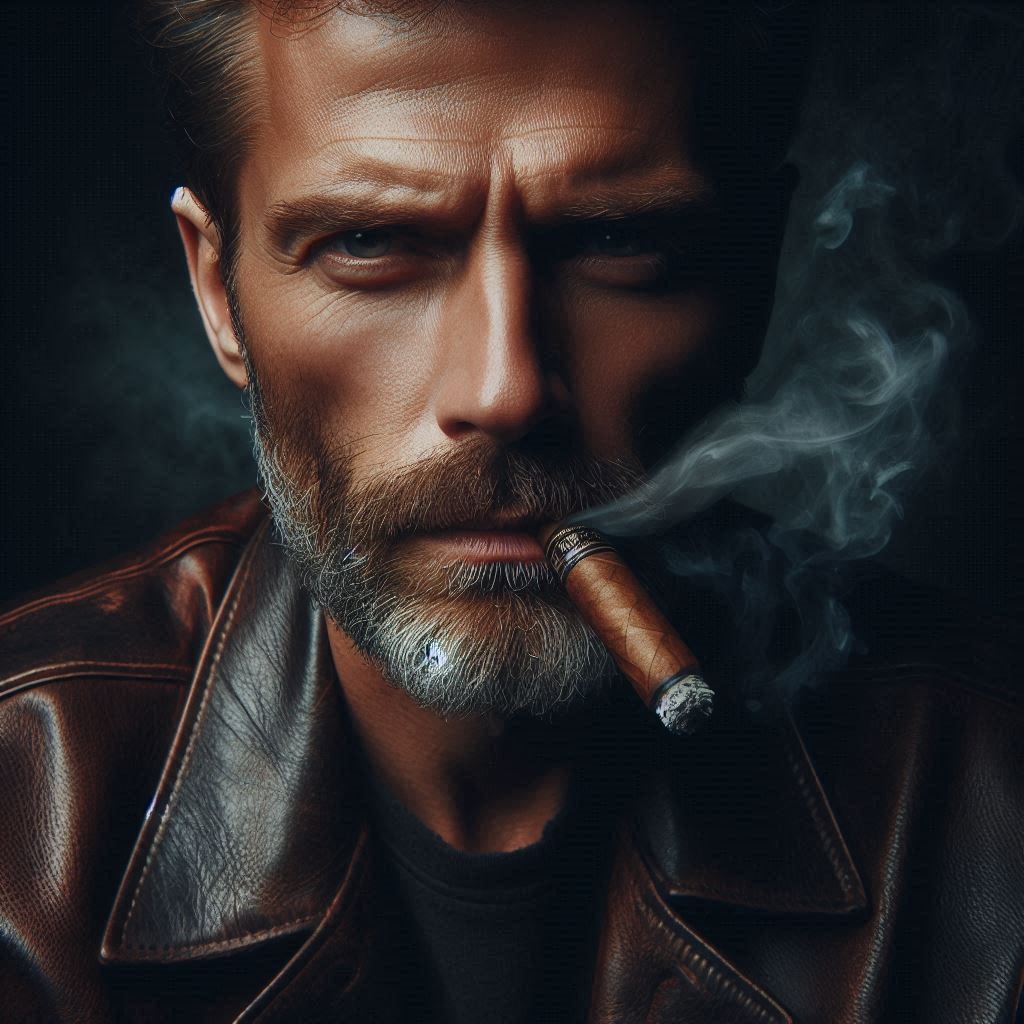 Man smoking cigar in leather jacket