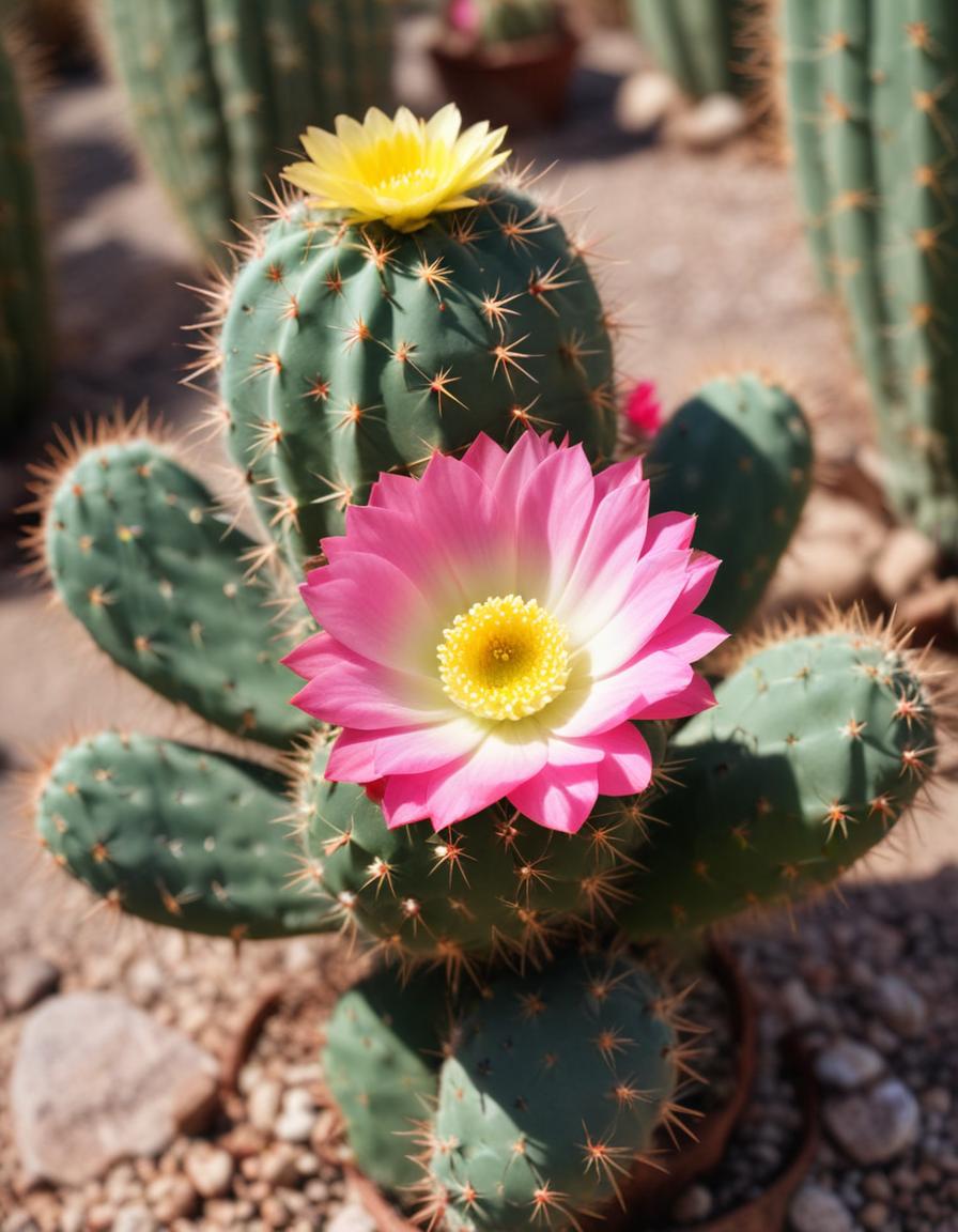 A pink and yellow cactus flower blooms in a sunny garden setting.