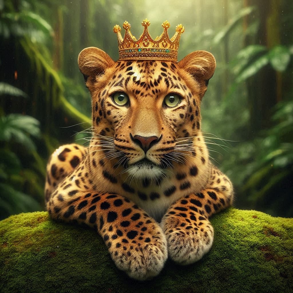 animal, cat, crown, eyes, fierce, forest, golden, green, jungle, king, leopard, majestic, moss, nature, powerful, predator, regal, spotted, wild, wildlife