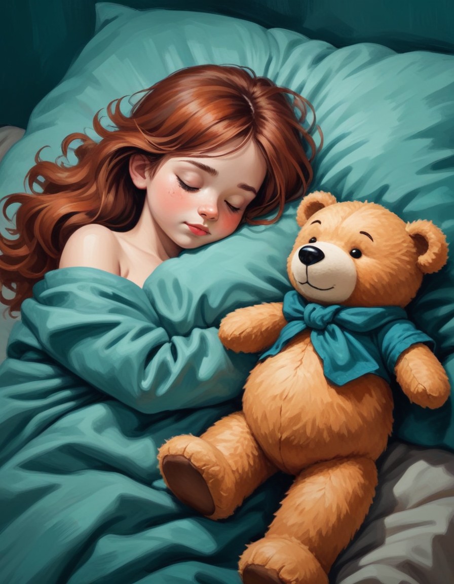A young girl with red hair sleeps peacefully in bed, hugging a teddy bear.