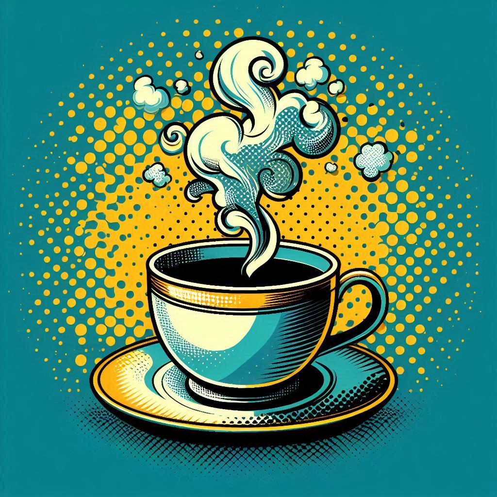 A cup of coffee sits on a saucer, steaming with a whimsical, cartoonish cloud of smoke. The background is teal with a yellow polka dot pattern.